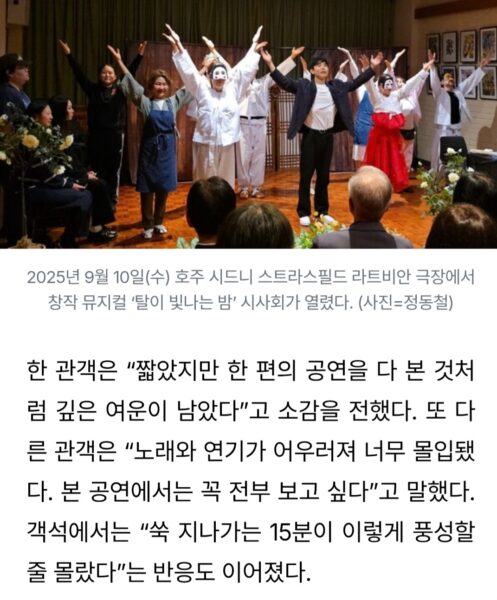 공연은 끝났지만, 뱅들의 진짜 이야기는 이제부터 시작됩니다. < 탈밤> 배우 인터뷰 공개 Link: https://www.hanhotimes.com/news/articleView.html?idxno=6764 2025년 9월 26일부터 28일까지 시드니 콩코스에서 공연한 창작 뮤지컬 ‘탈이 빛나는 밤’에서 빛나는 연기를 보여준 배우들을 만나 그들의 삶과 꿈 그리고 예술에 대해 듣는다. <한호타임즈 출처> 김도연 역을 맡은 이정아 배우는 한국에서 극단 민중/에이콤에서 활동하면서 ‘아가씨와 건달들’, ‘올리버 트위스트’, ‘누가 누구’, ‘국물 […]